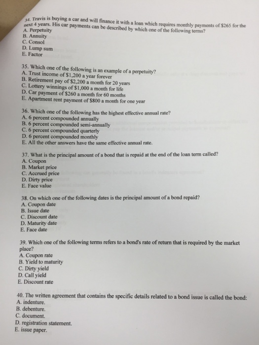 Travis is buying a car and will finance it with a loan that requires monthly payments of 265 for the next four years. Travis Moll Finance Manager Lexus of Wesley Chapel. A Perpetuity B Annuity C Consol D Lump sumE Factor.